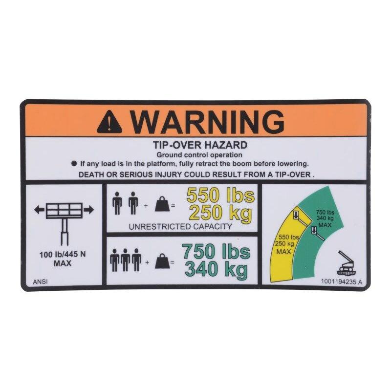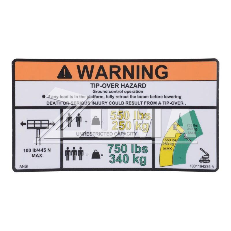 JLG Part # 1001194235 - DECAL, WARNING MAX CAP. (ANSI)