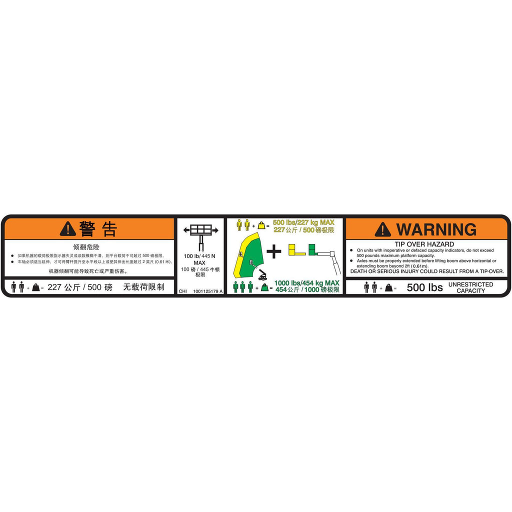 JLG Part # 1001125179 - DECAL, DUAL CAP. (CHI, ENG) (PLF)