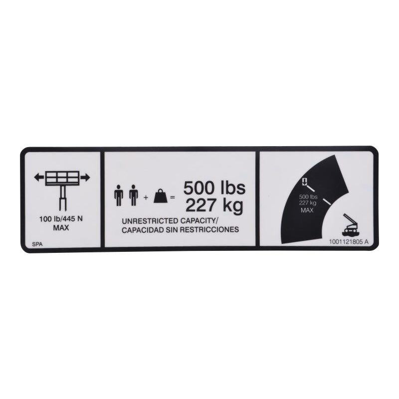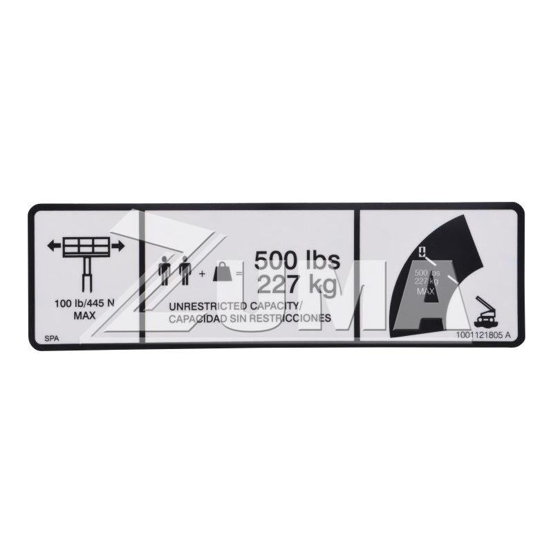 JLG Part # 1001121805 - DECAL, MAX CAP. 500LBS/227KG